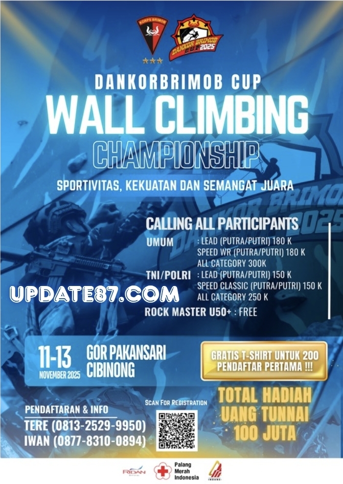 Cibinong, Jawa Barat – Saatnya para pecinta olahraga panjat tebing menunjukkan kemampuan terbaik! Dankor Brimob Cup 2025 hadir sebagai ajang kompetisi bergengsi dengan mengusung semangat “Sportivitas, Kekuatan, dan Semangat Juara”.