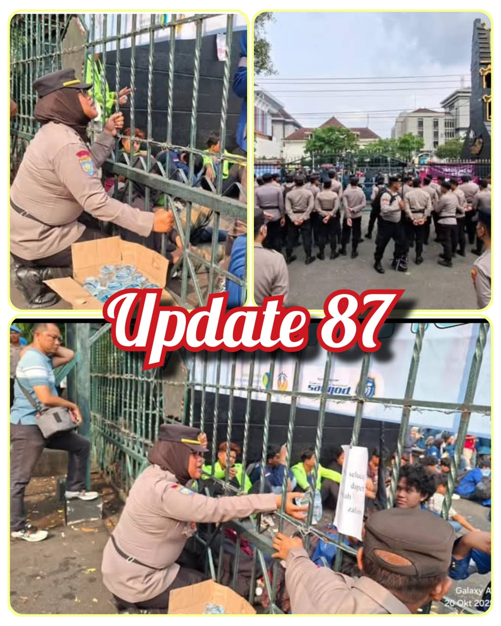 Momen humanis juga tampak ketika Polwan negosiator berinteraksi hangat dengan beberapa pengunjuk rasa dari balik pintu gerbang. Di tengah cuaca yang terik, petugas bahkan membagikan air mineral kepada para pengunjuk rasa agar tidak dehidrasi saat berorasi di bawah terik matahari.