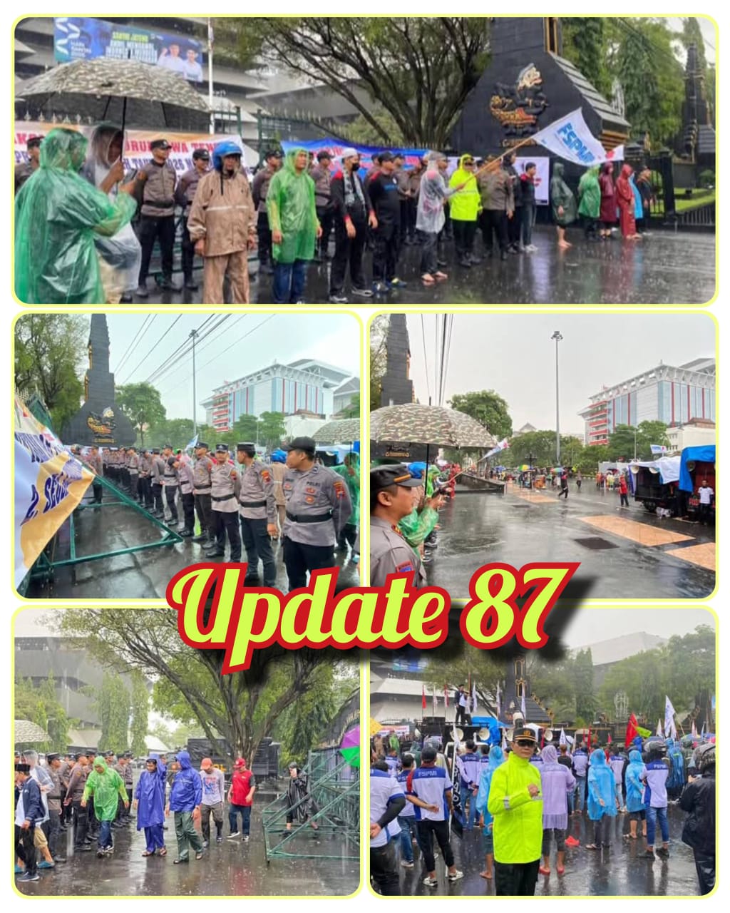 Semarang, Update 87.com || – Rintik hujan tak menyurutkan semangat personel Polrestabes Semarang dalam melaksanakan tugas pengamanan aksi unjuk rasa yang digelar oleh Aliansi Buruh Jawa Tengah, Rabu (22/10/2025), di depan Kantor Dinas Tenaga Kerja dan Transmigrasi (Disnakertrans) Provinsi Jawa Tengah serta halaman Kantor Gubernur Jateng, Jalan Pahlawan, Kota Semarang.