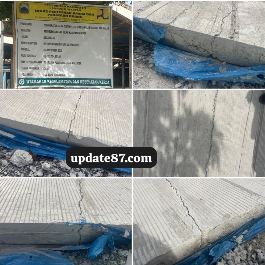 UPDATE87.COM — Lampung Selatan, Warga di Desa Palas Pasemah, Kecamatan Palas, Kabupaten Lampung Selatan mengungkapkan keprihatinan dan kekecewaan terhadap proyek rekonstruksi jalan yang dilaksanakan di Dusun 01, 03, dan 04. Proyek yang bernilai hampir Rp 1 miliar ini diduga sudah menunjukkan kerusakan dini — hanya beberapa hari setelah pengerjaan selesai – yang memunculkan pertanyaan serius tentang kualitas pekerjaan, pengawasan, dan penggunaan anggaran publik.