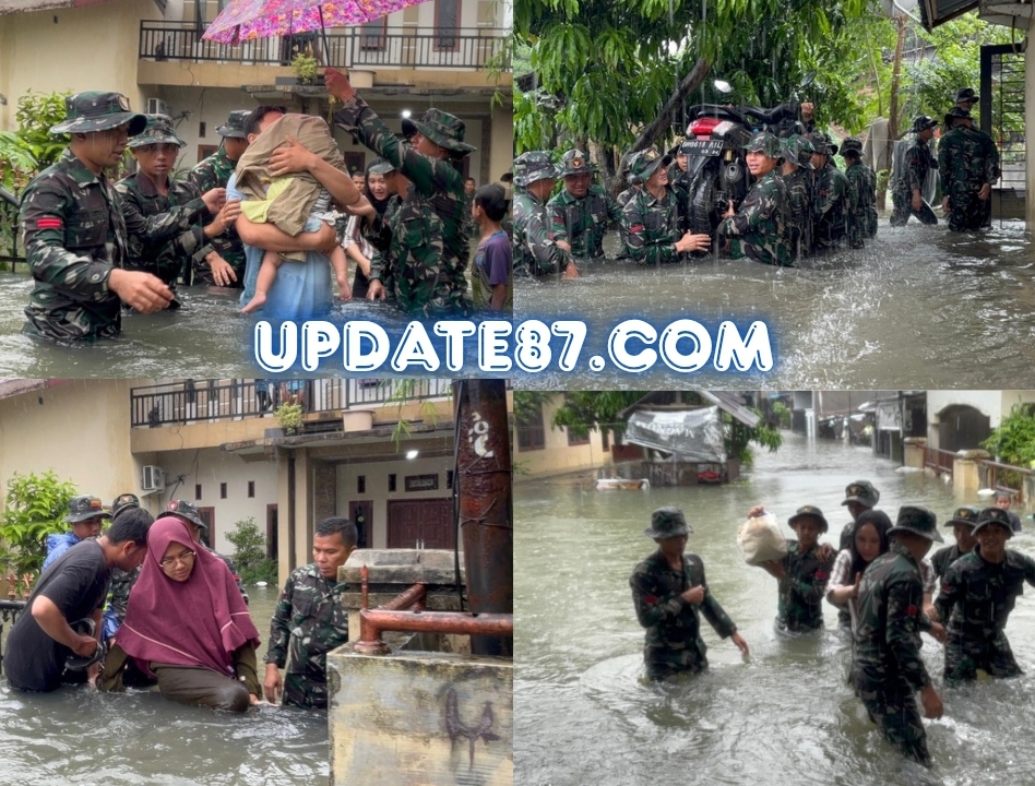 Prajurit Yonkav 6/NK Bantu Warga Terjebak Banjir di Asam Kumbang