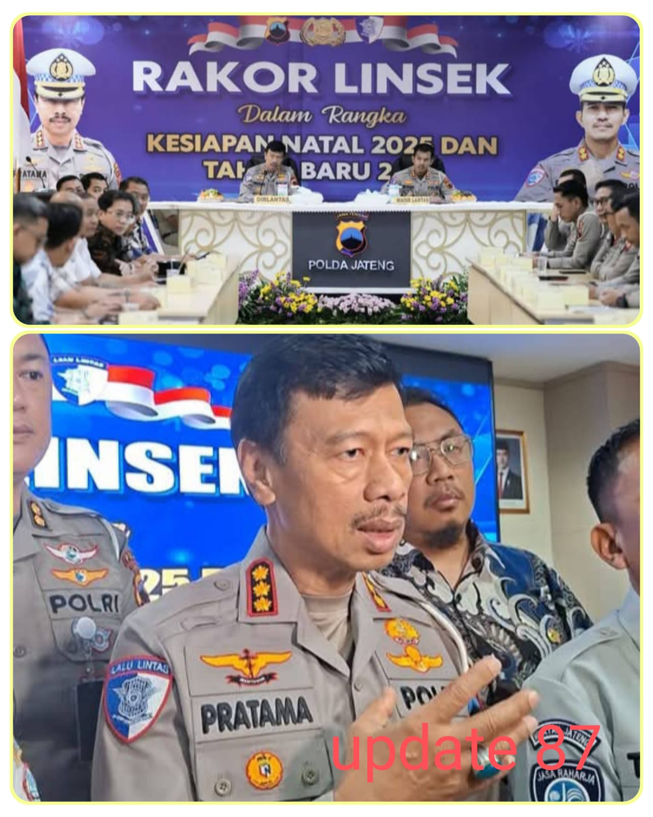 Semarang, Update 87. Com || Polda Jawa Tengah menggelar Rapat Koordinasi Lintas Sektoral (Rakor Linsek) dalam rangka kesiapan pengamanan Natal 2025 dan Tahun Baru 2026 (Nataru). Kegiatan diselenggarakan pada Jumat (5/12/2025) pagi di Aula Lantai 2 Mapolda Jateng ini dipimpin langsung oleh Direktur Lalu Lintas Polda Jateng (Dirlantas), Kombes Pol Pratama Adhyasastra.