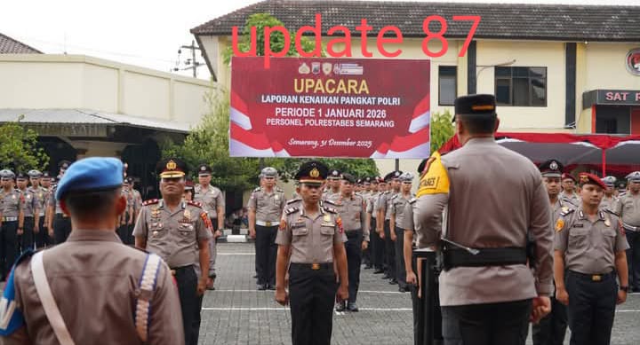 Semarang, Update 87.com || Polrestabes Semarang menggelar Upacara Kenaikan Pangkat Perwira dan Bintara Polri Periode TMT 1 Januari 2026 yang berlangsung khidmat di Halaman Apel Polrestabes Semarang, Rabu (31/12/2025) pagi. Upacara dipimpin langsung oleh Kapolrestabes Semarang Kombes Pol. M. Syahduddi, S.I.K., M.Si selaku Inspektur Upacara.