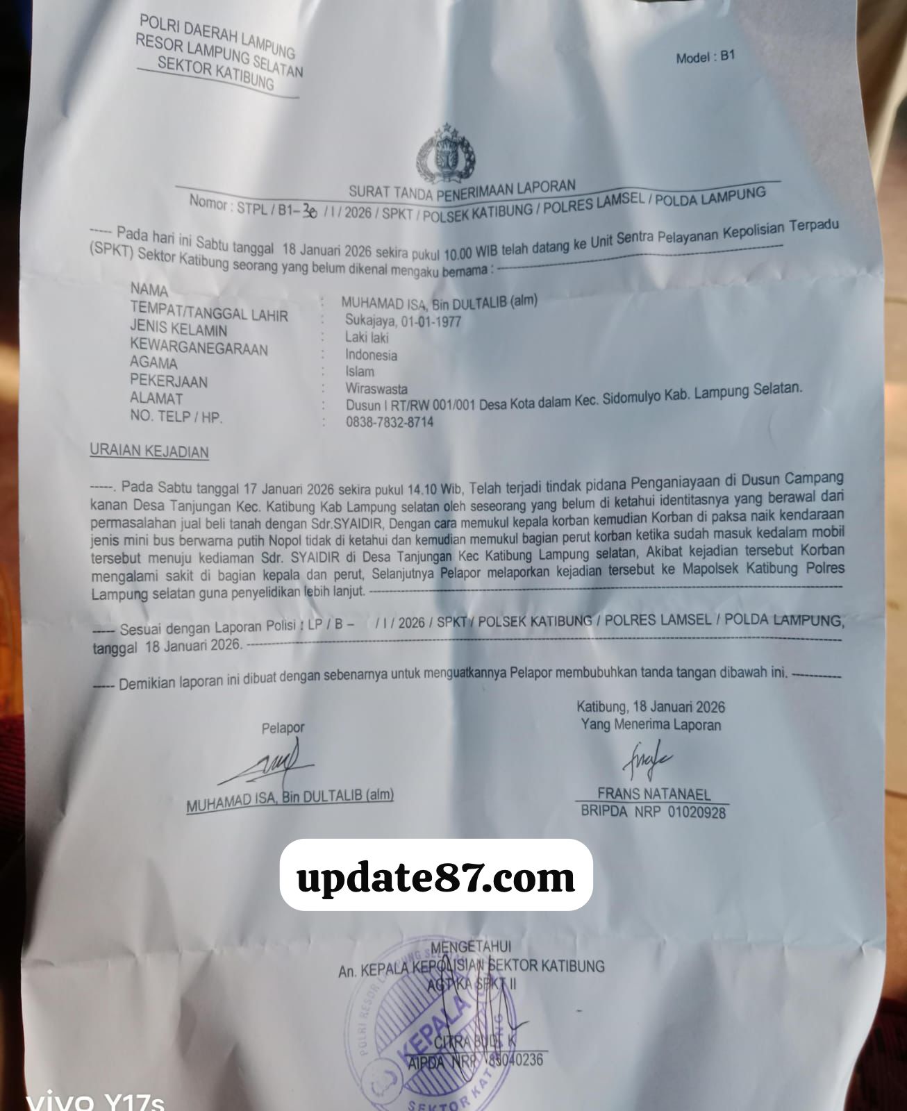 Berdasarkan Surat Tanda Penerimaan Laporan (STPL) Polsek Katibung bernomor STPL/B1-30/I/2026/SPKT/Polsek Katibung/Polres Lamsel/Polda Lampung, korban atas nama Muhamad Isa (49) melaporkan peristiwa yang terjadi pada Sabtu, 17 Januari 2026 sekitar pukul 14.10 WIB di wilayah Desa Tanjungan, Kecamatan Katibung, Lampung Selatan.