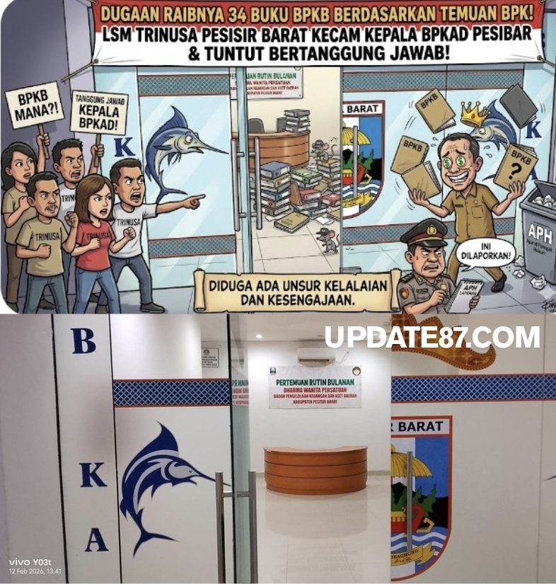 PESISIR BARAT – Lembaga Swadaya Masyarakat (LSM) TRIGA NUSANTARA (TRINUSA) Kabupaten Pesisir Barat menyoroti dugaan hilangnya 34 buku kepemilikan kendaraan bermotor (BPKB) yang masuk dalam catatan aset daerah. Ketua TRINUSA Pesisir Barat, Efendi, didampingi Sekretarisnya “S.Purnomo” aktifis dan Pemerhati anti Korupsi mendesak Badan Pengelola Keuangan dan Aset Daerah (BKAD) Pesisir Barat segera mempertanggungjawabkan temuan tersebut.